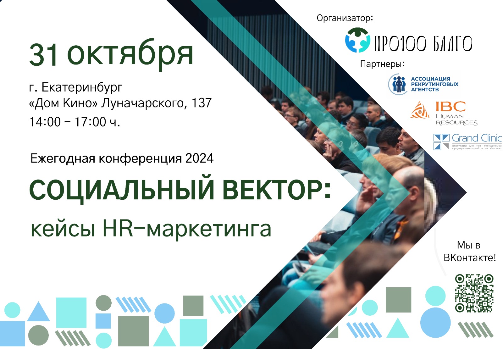 Приглашаем Вас и представителей вашей компании принять участие на Ежегодной конференции «Социальный вектор: кейсы HR-маркетинга», которая пройдет 31 октября в Доме кино по адресу: г. Екатеринбург, Луначарского 137.